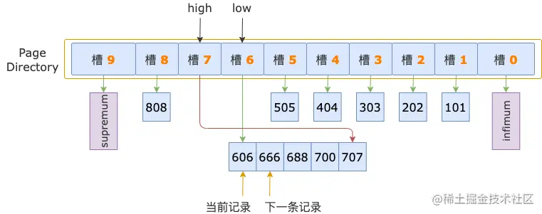 二分法查找结束时,low = 6(槽 6),其最大记录的 id = 606;high = 7(槽 7),其最大记录的 id = 707。