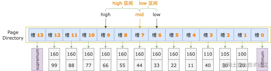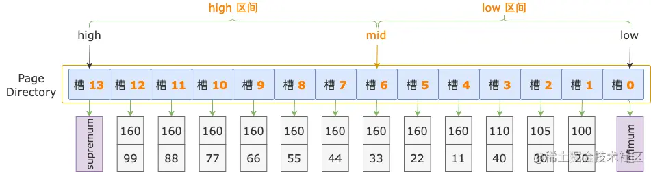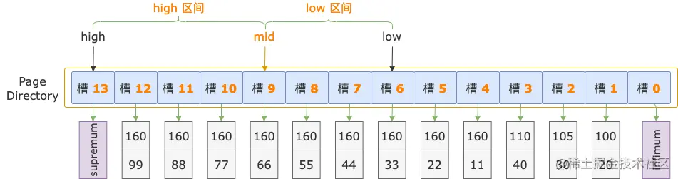 接着比较 i2 字段的值,扫描区间左端点的 i2 字段值(44)大于索引记录中的 i2 字段值(33),说明扫描区间左端点值 160, 44 位于 high 区间(槽 6 ~ 13)。