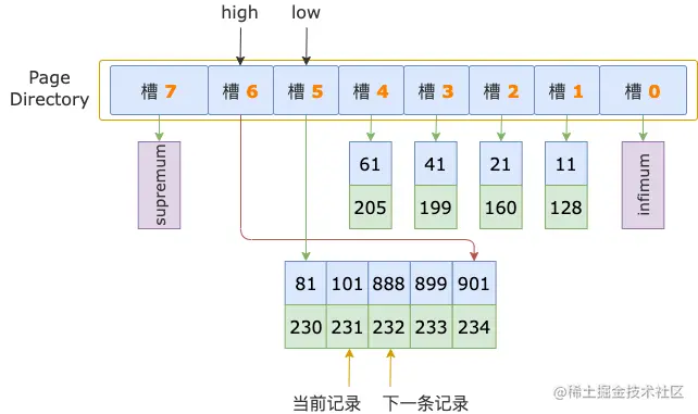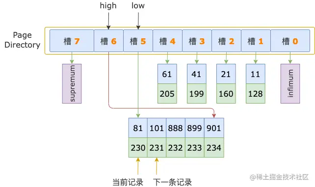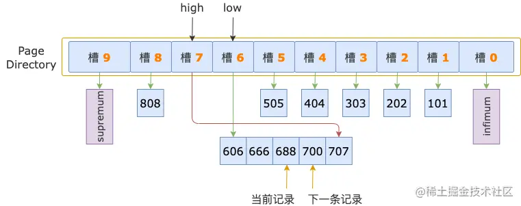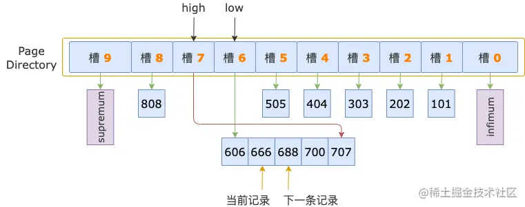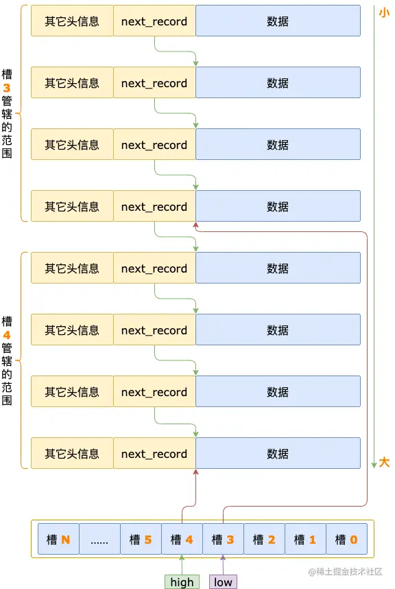从 low 槽的最大记录开始,通过头信息中的 next_record 读取下一条记录。