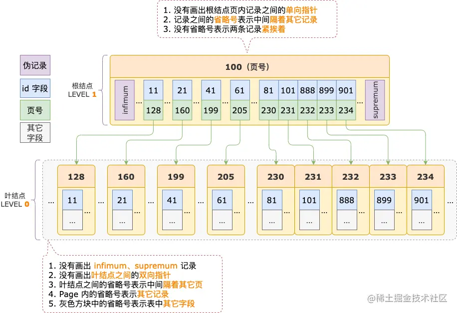 根结点、内结点的记录中指向子结点索引页的页号。 - InnoDB B-TREE