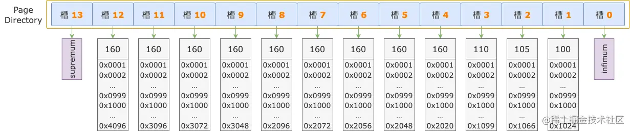 infimum 槽,只包含一条记录,就是infimum 伪记录。supremum 槽,包含 1 ~ 8 条记录,最后一条是supremum 伪记录,其余的是用户记录。普通槽,包含 4 ~ 8 条用户记录。