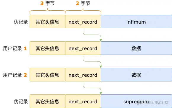 索引页中有用户记录时,infimum 的 next_record 指向第一条用户记录。