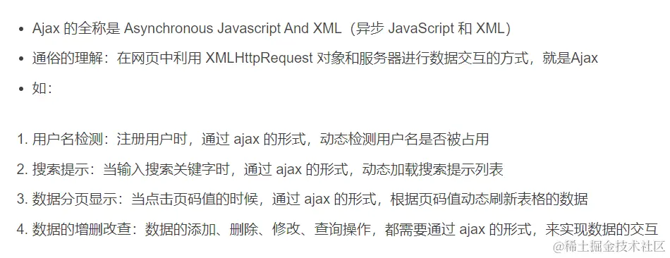 - AJAX(Asynchronous Javascript And XML)翻译成中文就是“异步Javascript和XML”。即使用Javascript语言与服务器进行异步交互,传输的数据为XML(当然,传输的数据不只是XML)。
