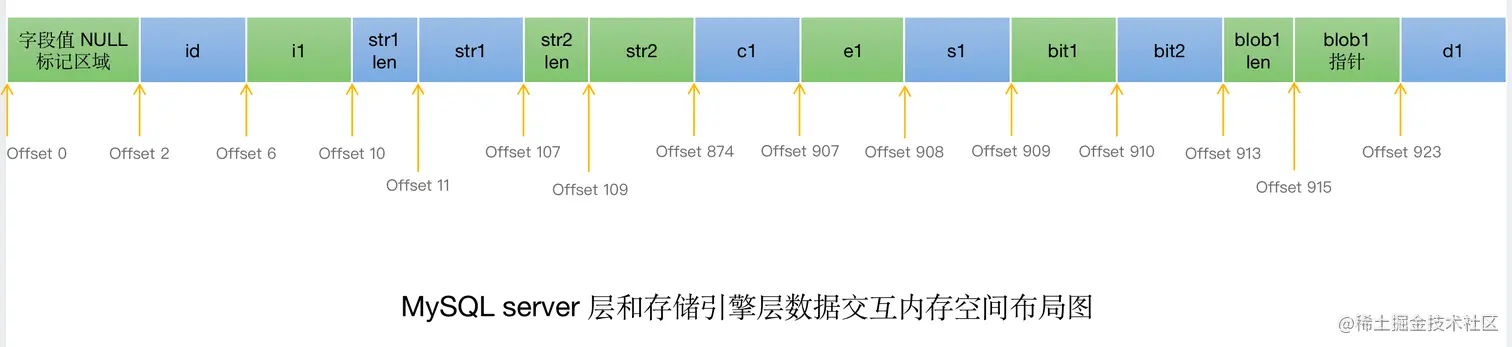示例表和内存布局图都有了,接下来我们对照着图来分析一下各个字段对应的内存空间的情况: