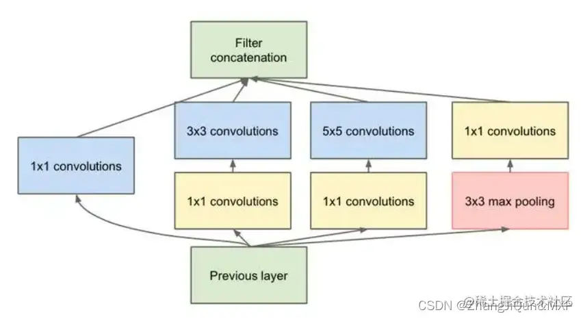 主要的创新在于他的Inception,这是一种网中网(Network In Network)的结构,即原来的结点也是一个网络。Inception一直在不断发展,目前已经V2、V3、V4了,感兴趣的同学可以查阅相关资料。Inception的结构如图9所示,其中1*1卷积主要用来降维,用了Inception之后整个网络结构的宽度和深度都可扩大,能够带来2-3倍的性能提升。