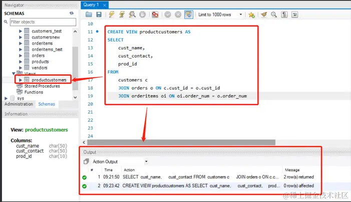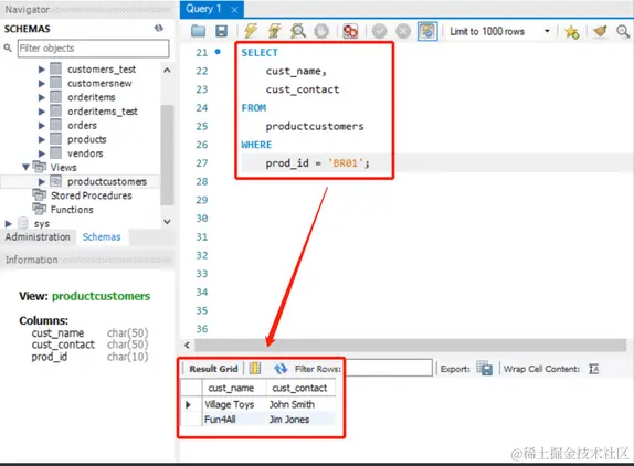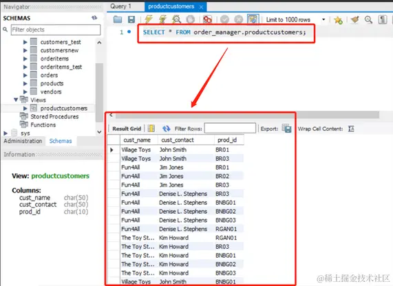 视图 productcustomers 中的内容如下:
