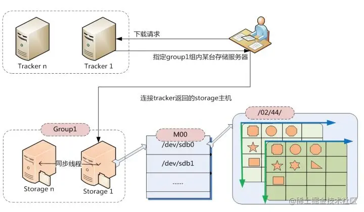 - 通过组名tracker能够很快的定位到客户端需要访问的存储服务器组是group1,并选择合适的存储服务器提供客户端访问。