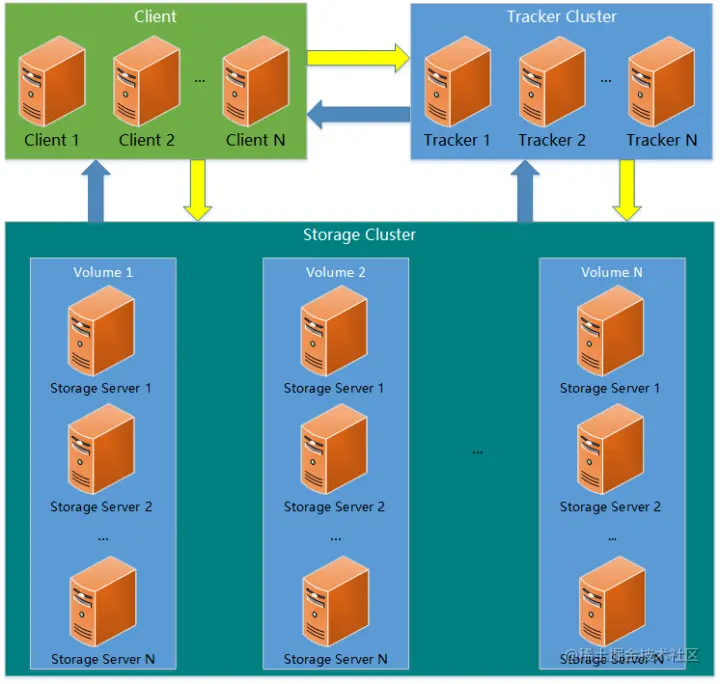 Storage集群 为了支持大容量,存储节点(服务器)采用了分卷(或分组)的组织方式。存储系统由一个或多个卷组成,卷与卷之间的文件是相互独立的,所有卷的文件容量累加就是整个存储系统中的文件容量。一个卷由一台或多台存储服务器组成,卷内的Storage server之间是平等关系,不同卷的Storageserver之间不会相互通信,同卷内的Storageserver之间会相互连接进行文件同步,从而保证同组内每个storage上的文件完全一致的。一个卷的存储容量为该组内存储服务器容量最小的那个,由此可见组内存储服务器的软硬件配置最好是一致的。卷中的多台存储服务器起到了冗余备份和负载均衡的作用