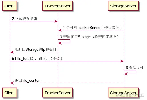 跟upload file一样,在downloadfile时客户端可以选择任意tracker server。tracker发送download请求给某个tracker,必须带上文件名信息,tracke从文件名中解析出文件的group、大小、创建时间等信息,然后为该请求选择一个storage用来服务读请求。tracker根据请求的文件路径即文件ID 来快速定义文件。