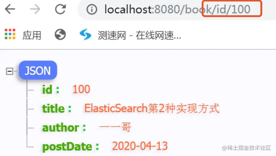 Book book = new Book("100", "ElasticSearch第2种实现方式", "一一哥", "2020-04-13");