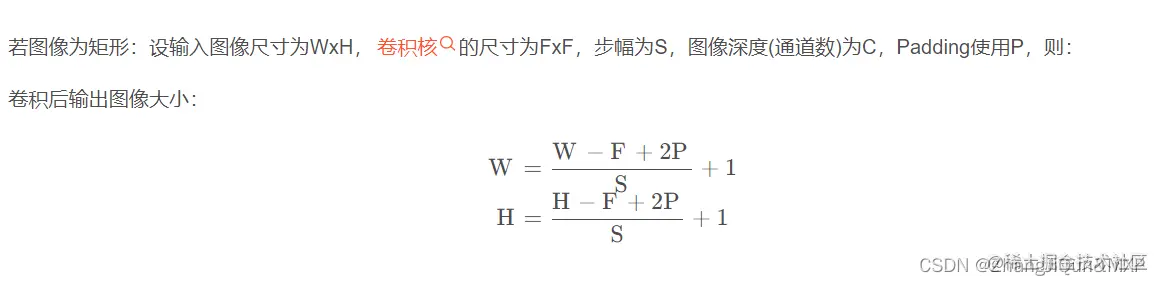 1、卷积层(Conv Layer)的输出张量(图像)的大小 定义如下: O=输出图像的尺寸。 I=输入图像的尺寸。 K=卷积层的核尺寸 N=核数量 S=移动步长 P =填充数 输出图像尺寸的计算公式如下: 在这里插入图片描述