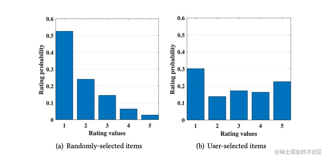 选择偏差主要发生在用户的显示反馈中,比如需要用户对物品进行数字打分的场景(图书的星级评分,电影的喜好打分等场景),因为用户可以自由选择要评分的项目,因此我们收集到的打分数据是稀疏的,并不是所有数据的代表性样本,这就是选择偏差的定义。