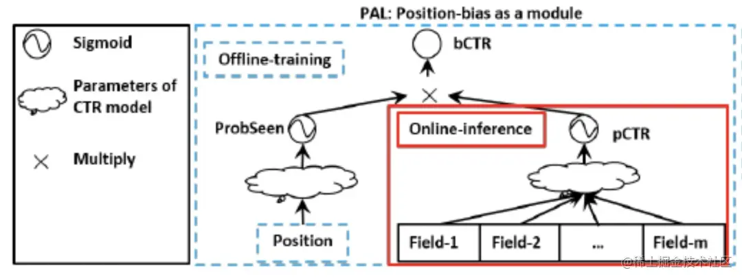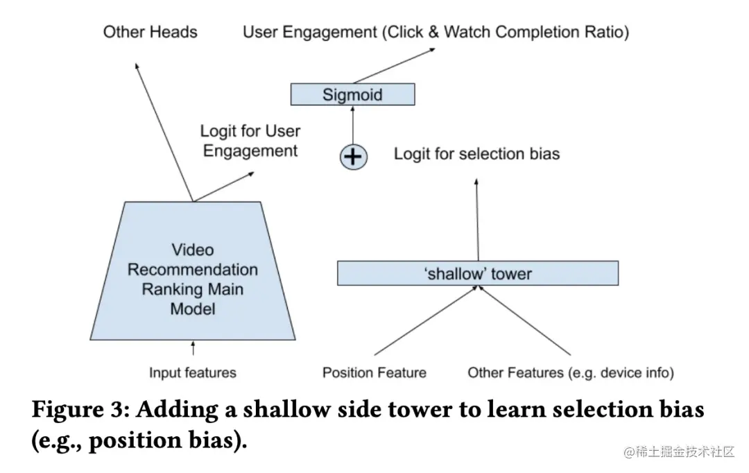 YouTube提出的做法类似wide&deep,即添加一个浅层网络(shallow tower),输入position feature, device info(原因是在不同的设备上会观察到不同的位置偏差), 以及其他能够带来位置偏差的特征,输出为position bias分量。这就将user engagement和position bias 独立开来了。
