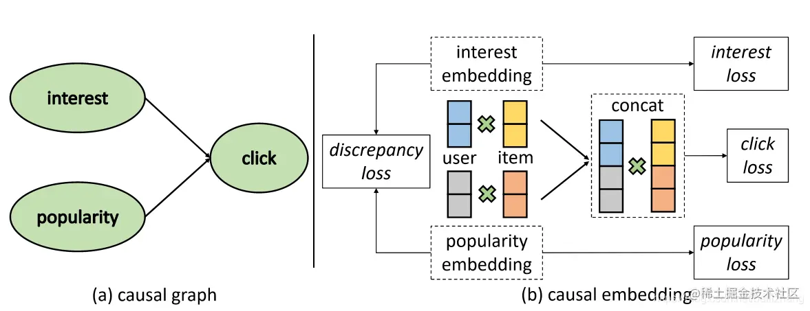 在实际应用过程中如图b,可以将用户和物品的Emebdding解耦为兴趣Embedding和流行度Embedding,利用多任务的框架训练,让兴趣Embedding和流行度Embedding尽可能独立,空间足够远,最终在线上应用的时候,可以只用兴趣的Embedding,以此来消除流行度偏差。