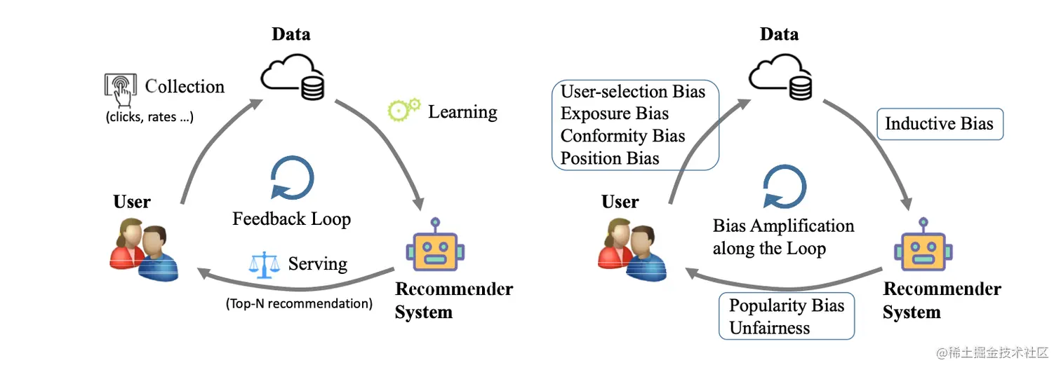 - 进一步增加了流行物品的曝光机会,导致未来收集的数据更加的不平衡,导致马太效应;
