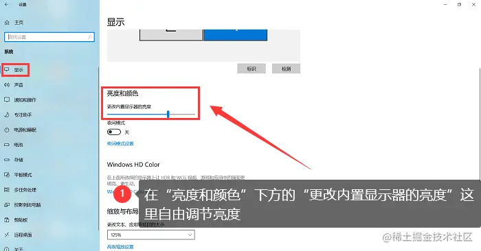 第2步: 在打开的设置窗口里,找到【更改内置显示器的亮度】,自由拉动调节你想改变的亮度。如下图: