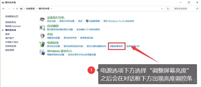 第3步: 在【电源选项】里,单击【调节屏幕亮度】。之后会在对话框下方看到亮度调控条(部分电脑没有这个),通过电脑鼠标拖拽标尺就可以达到调节亮度的目的。如下图: