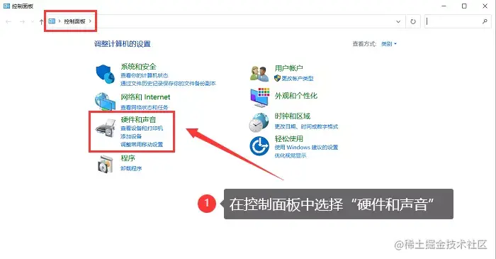 第2步: 搜索【控制面板】并打开它,单击【硬件和声音】。如下图: