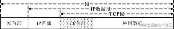 位于传输层的TCP数据分组称为段(Segment),又译为报文段、数据段或分段。TCP将来自应用层的数据分块并封装成TCP段进行发送。TCP段封装在IP数据报中,然后再封装成数据链路层中的帧,如图所示。