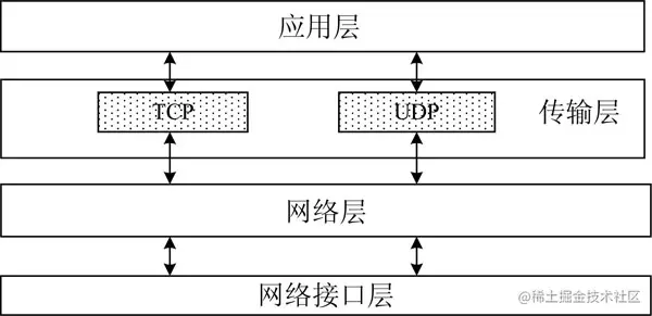 在OSI模型中,传输层是介于网络层和会话层之间的一个中间层次,弥补高层服务和网络层服务之间的差距,并向高层用户(应用程序)屏蔽通信子网的细节,使高层用户看到的只是在两个传输实体间的一条端到端的、用户可控的、可靠的数据通路。在TCP/IP模型中,由于3个高层简化为1个应用层,传输层是介于网络层与应用层之间的一个层次。其中两个主要协议TCP与UDP在TCP/IP协议栈中的位置如图所示。