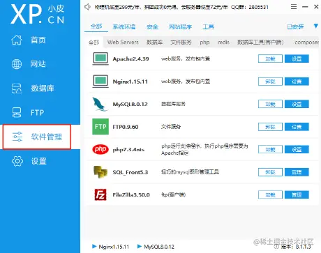 在软件和网页文件都准备好后,我们就可以正式开始网页运行的准备。首先是使用phpstudy设立piwigo网页的运行环境。我们打开phpstudy主界面,在左侧“软件管理”页面下,安装nginx、php、SQL-Front、MySQL、FileZilla、FTP这几个插件软件,用于构建piwigo网页正常运行的环境。