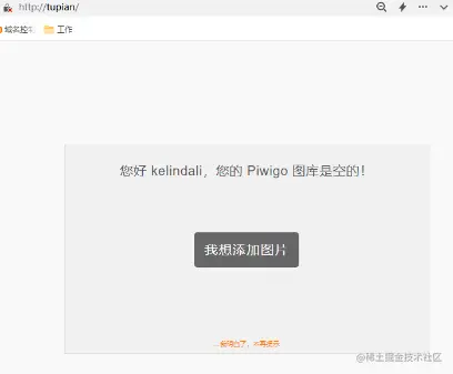 安装完成后,piwigo网页会显示安装成功的通知,并显示没有图片存入的网页状态,我们随便上传一两张图片,避免访问piwigo网页时出现模板加载错误的情况。