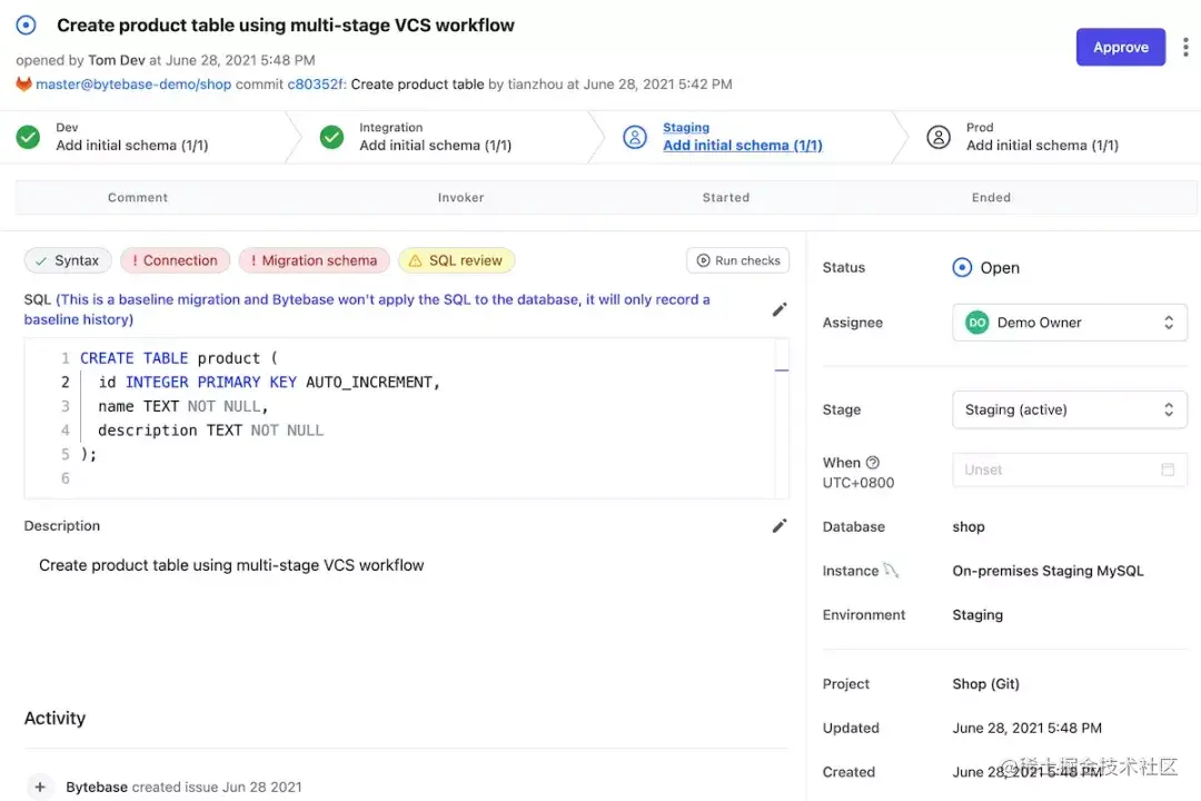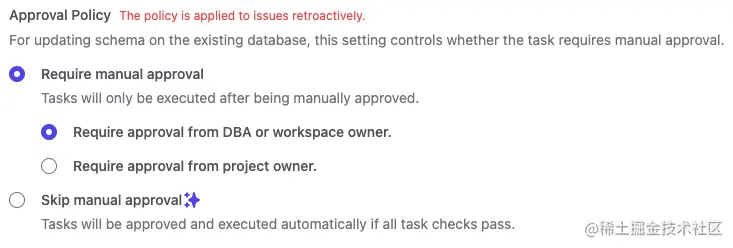 - 还可以配置不同的审核策略,比如 dev 环境,可以跳过 DBA 审核;prod 环境,必须 DBA 审核或者也可以要求 project owner 审核。