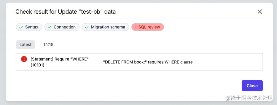 - 用户可以配置 SQL Review 审核规则。如下图,在数据变更流程中,规则阻止了用户执行不带 WHERE 的 DELETE 语句。并且针对研发流程中的 dev, test, prod 等不同环境,用户还可以配置不同的规则。