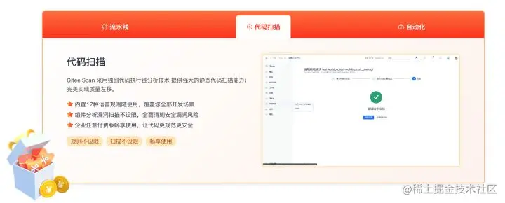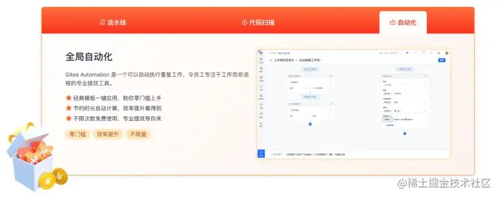 在 Gitee 企业版年终狂欢季进行的同时,Gitee 团队也在努力为企业和团队提供更强的产品能力,继项目流水线和 GiteeScan 的全新进化后,Gitee 企业版也在近日全新上线了 Gitee 自动化(Gitee Automation)功能。感兴趣的快去 Gitee 企业版试试吧。