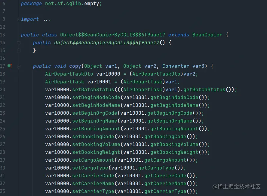 - Cglib BeanCopier:cglib(Code Generation Library)是一个强大的、高性能、高质量的代码生成类库,BeanCopier依托于cglib的字节码增强能力,动态生成实现类,完成对象的拷贝。