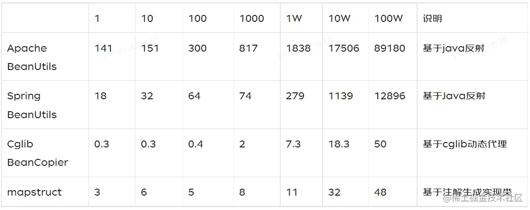 - 在数据规模不大的情况下,spring、cglib、mapstruct差异不大,spring框架下建议使用spring的beanUtils,不需要额外引入依赖包