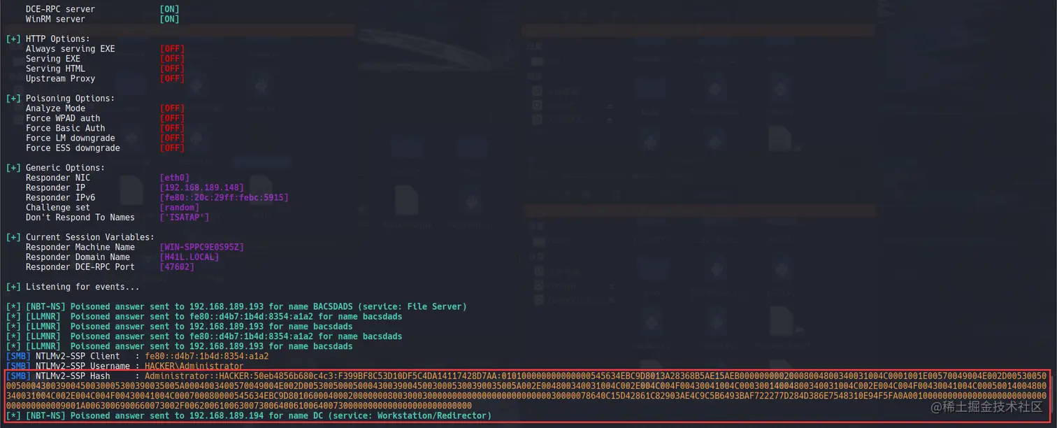 3、在kali中成功截获到客户端的Net-NTLM Hash