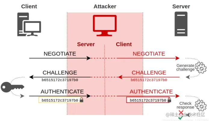 在Server视角下,Attacker是它的客户端,伪造客户端完成身份验证。