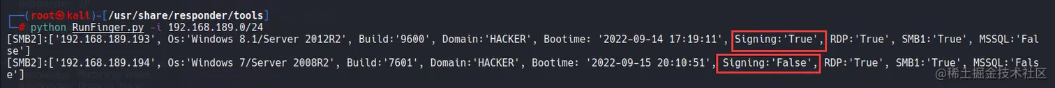 2、使用RunFinger.py脚本扫描域内机器的SMB签名的开放情况
