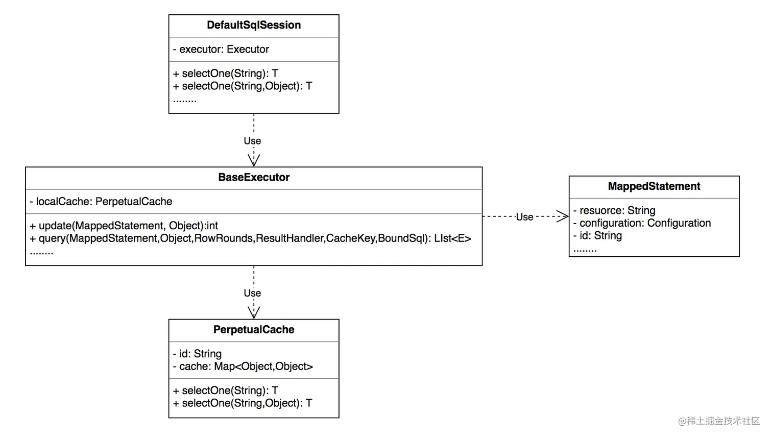 MyBatis 在开启一个数据库会话时,会创建一个新的 SqlSession 对象,SqlSession 对象中会有一个新的 Executor 对象,Executor 对象中持有一个新的 PerpetualCache 对象;当会话结束时,SqlSession 对象及其内部的 Executor 对象还有 PerpetualCache 对象也一并释放掉。