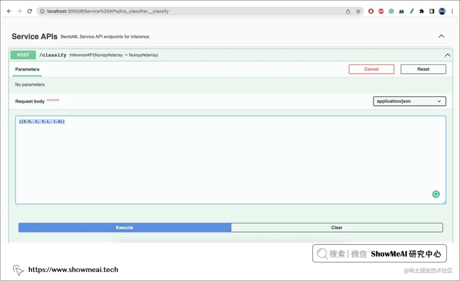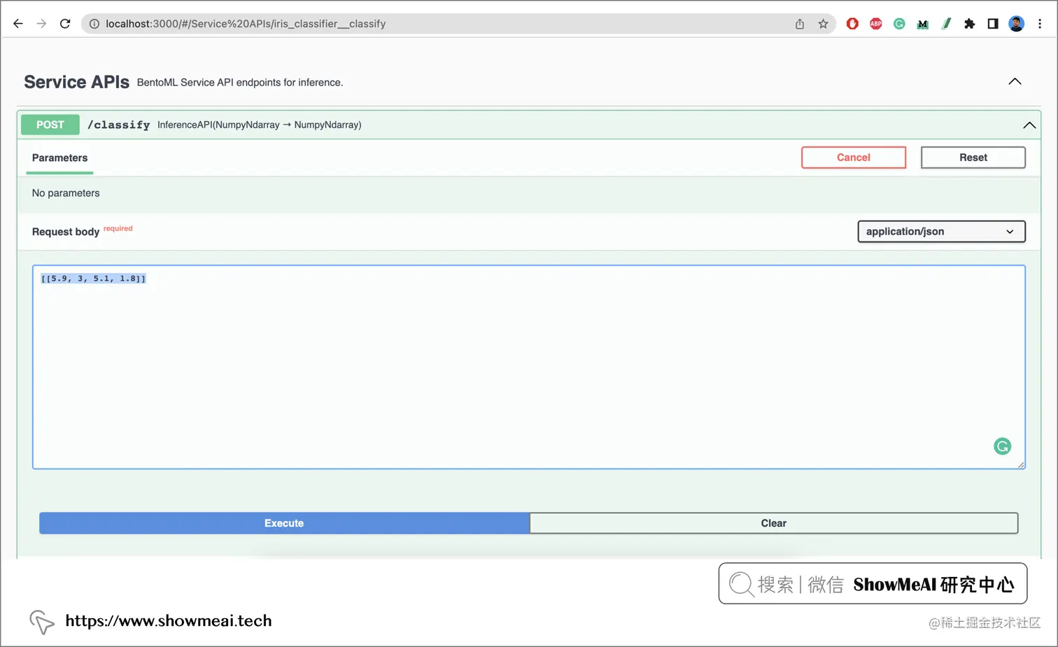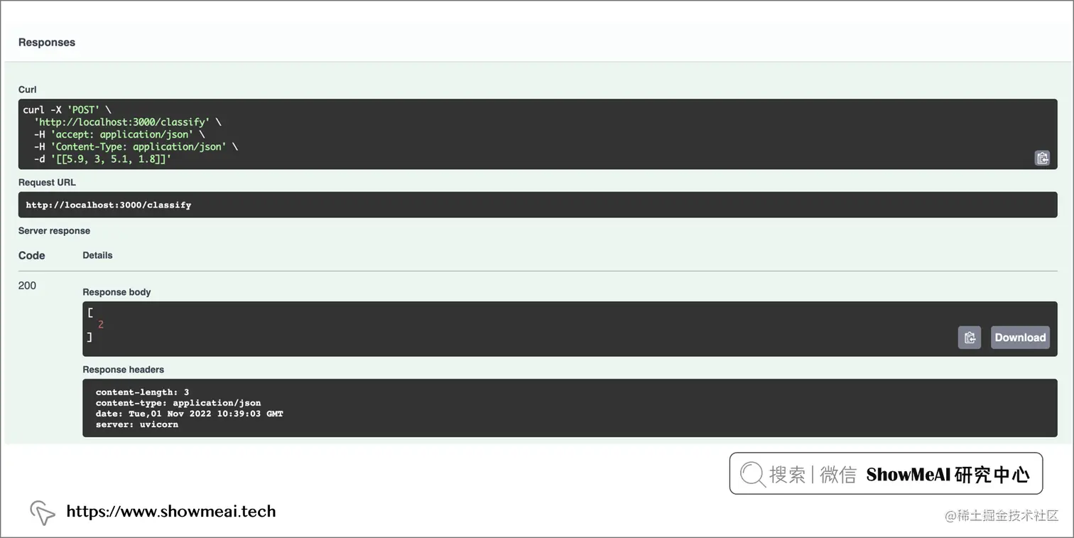 在下面的示例中 ,用api当有效负载数据(Numpy Ndarray 类型)通过 HTTP POST 请求发送到 /classify路径进行访问。