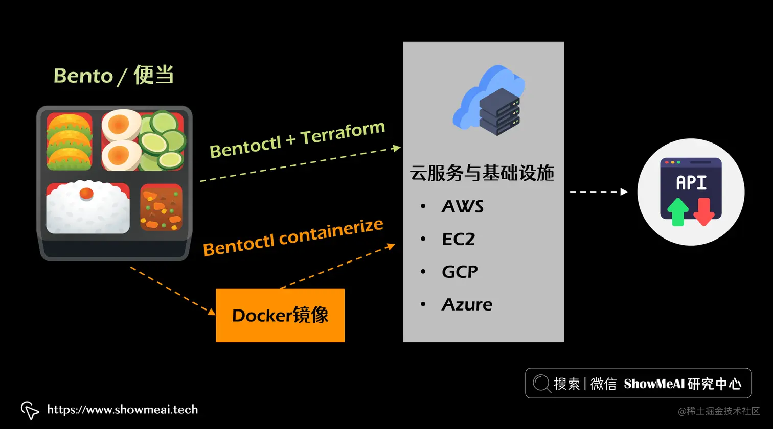 当 bento 构建完成后(下文会详细说明),你可以将它变成一个可以部署在云上的 Docker 镜像,或者使用 bentoctl(它依赖 Terraform) 将 bento 部署到任何云服务和基础设施上(例如 AWS Lambda 或 EC2、GCP Cloud Run、Azure functions等)。