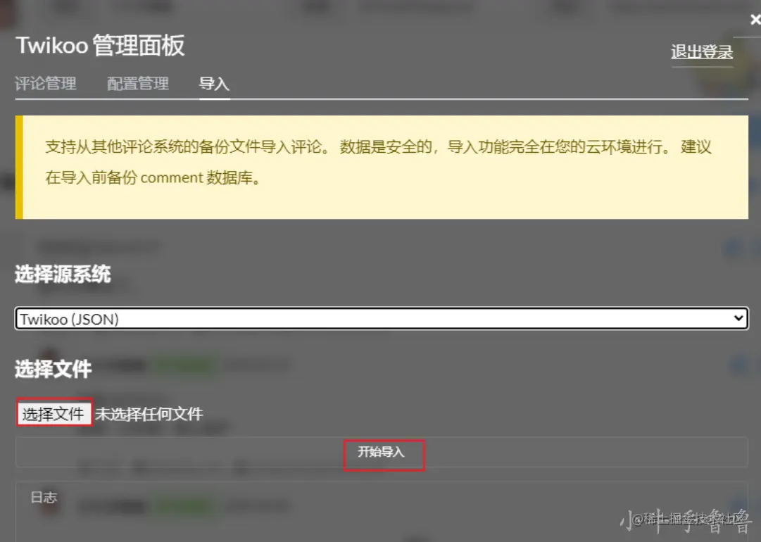 第一次打开twikoo面板,需要设置密码 然后选择导入按钮