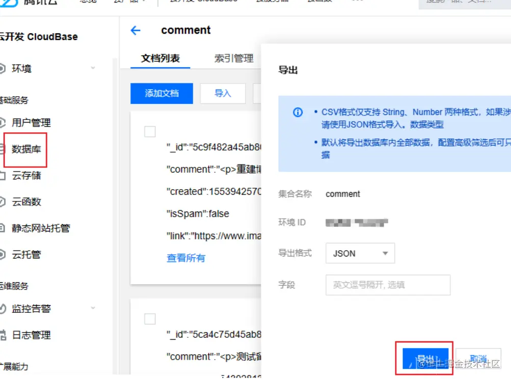 - 点击左侧的数据库,点击 comment 集合,点击导出按钮;