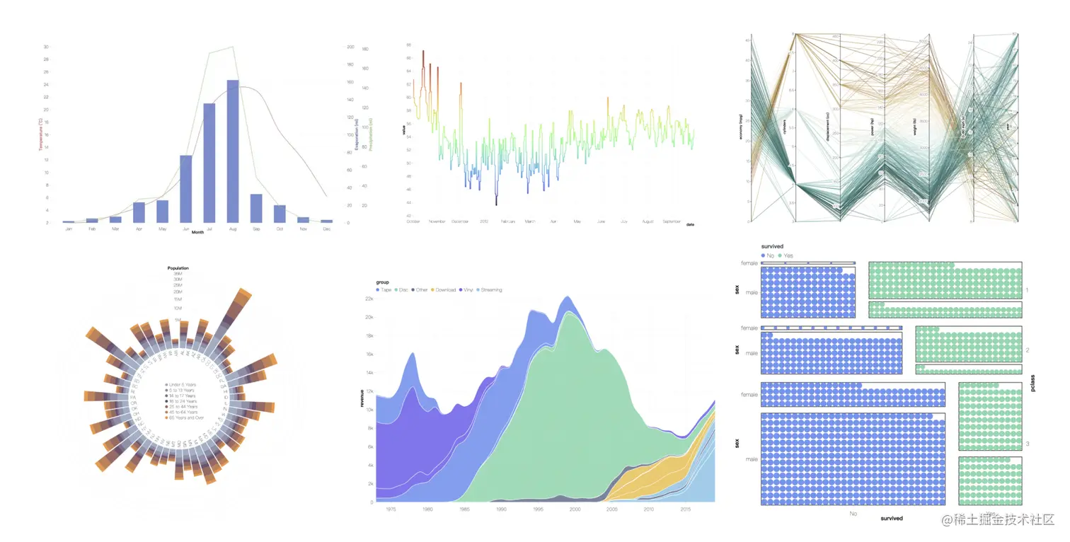 报表搭建是 G2 的基础能力。新版本中我们统一了几何图形(Geometry)和标注(Annotation) 的使用和实现方式,增加了更多的标识(Mark)、坐标系,提高了 G2 的灵活度和能绘制图表的数量,比如:平行坐标系、多轴图、向量图等等,也设计了单元可视化的语法。
