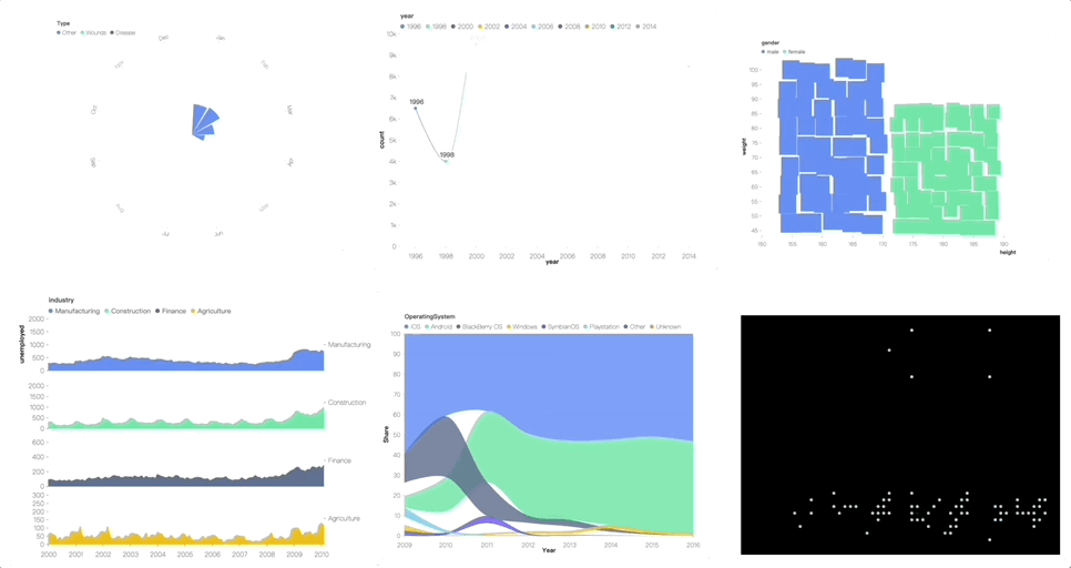 除了静态图表之外,我们设计了动画相关的语法,可以满足多样的可视化叙事需求。同时也支持渲染 Lottie 格式的动画。