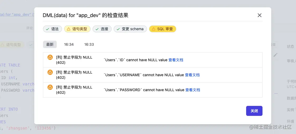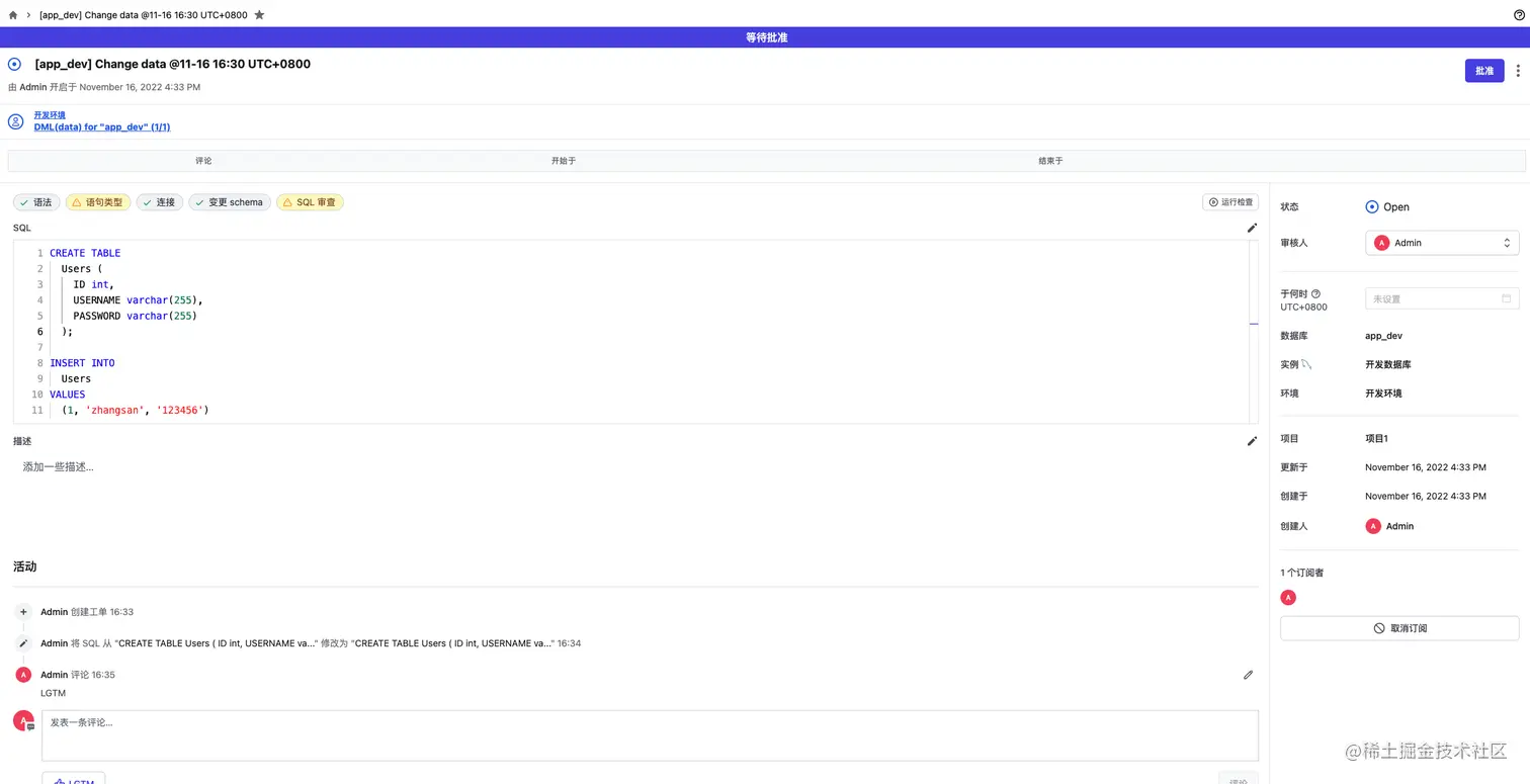 Bytebase 支持数据变更的自动审核,目前已覆盖业界常见规范,同时可以将审核能力与代码仓库进行集成,在 PR/MR 中自动审核 SQL 脚本。