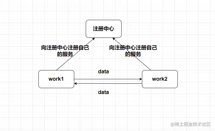 大概流程就是服务模块双方都会向注册中心注册自己的服务,然后work1客户端会通过代理proxy调用服务端,具体调用哪个服务,这里就是注册中心的用处了,work2接收到请求处理然后返回,