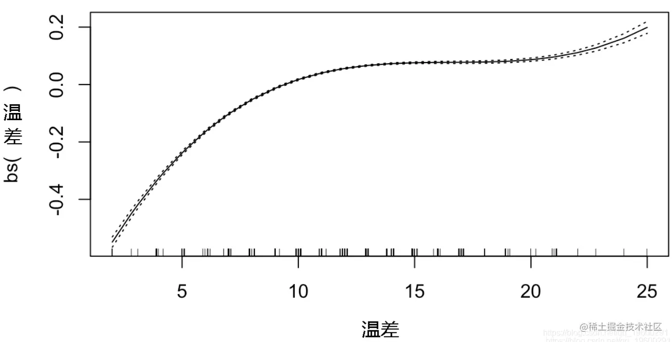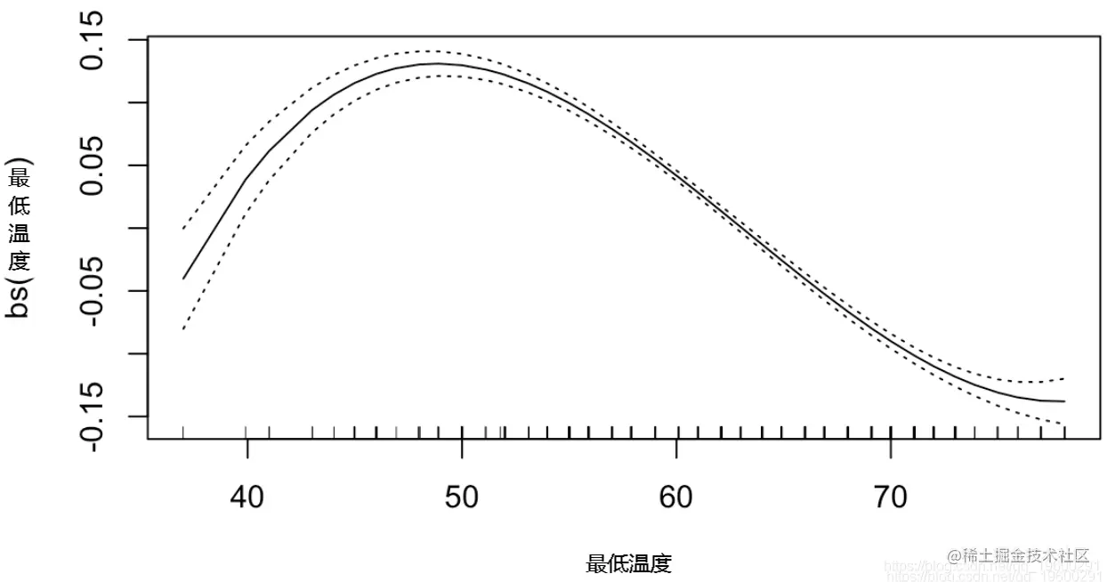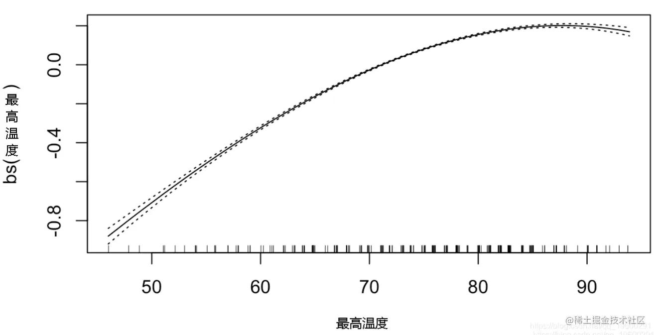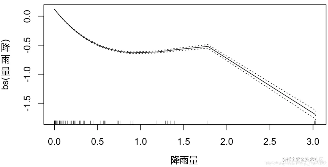 gam(数量~bs(最高温度)+bs(最低温度)+bs(降雨量)+I(降雨量==0),poisson