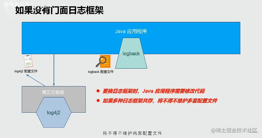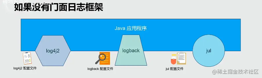如果多个日志框架共存,那么不得不维护多套配置文件(这个配置文件是指用户自定义的配置文件,如下),且不能使用第三方组件维护配置文件。这是因为日志文件的路径、日志级别、日志格式等等,只能有应用程序本身来进行维护。最坏的情况下,有可能需要在应用程序中维护好几套内容相同但格式不同的配置文件。