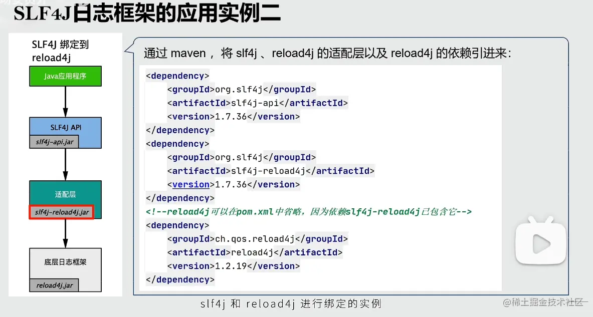 reload4j并不是基于SLF4J的API实现的,所以需要通过适配器进行转化,因此需要将适配层的依赖包一同导入,才能够使用。