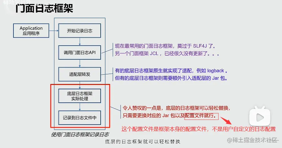 引入门面日志框架之后,应用程序和日志框架(框架的具体实现)之间有了统一的API接口(门面日志框架实现),此时应用程序只需要维护一套日志文件配置,且当底层实现框架改变时,也不需要更改应用程序代码。
