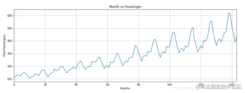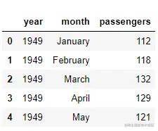 该数据集有三列:year,month,和passengers。passengers列包含指定月份旅行旅客的总数。让我们输出数据集的维度: