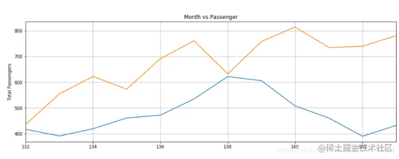 任务是根据前132个月来预测最近12个月内旅行的乘客人数。请记住,我们有144个月的记录,这意味着前132个月的数据将用于训练我们的LSTM模型,而模型性能将使用最近12个月的值进行评估。