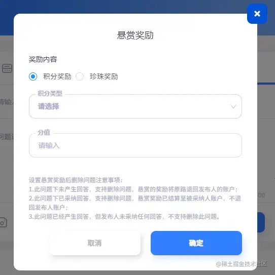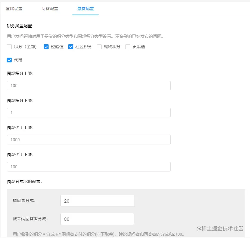 管理后台可配置问题的字数限制、悬赏奖励类型、围观费用分配比例及限制。